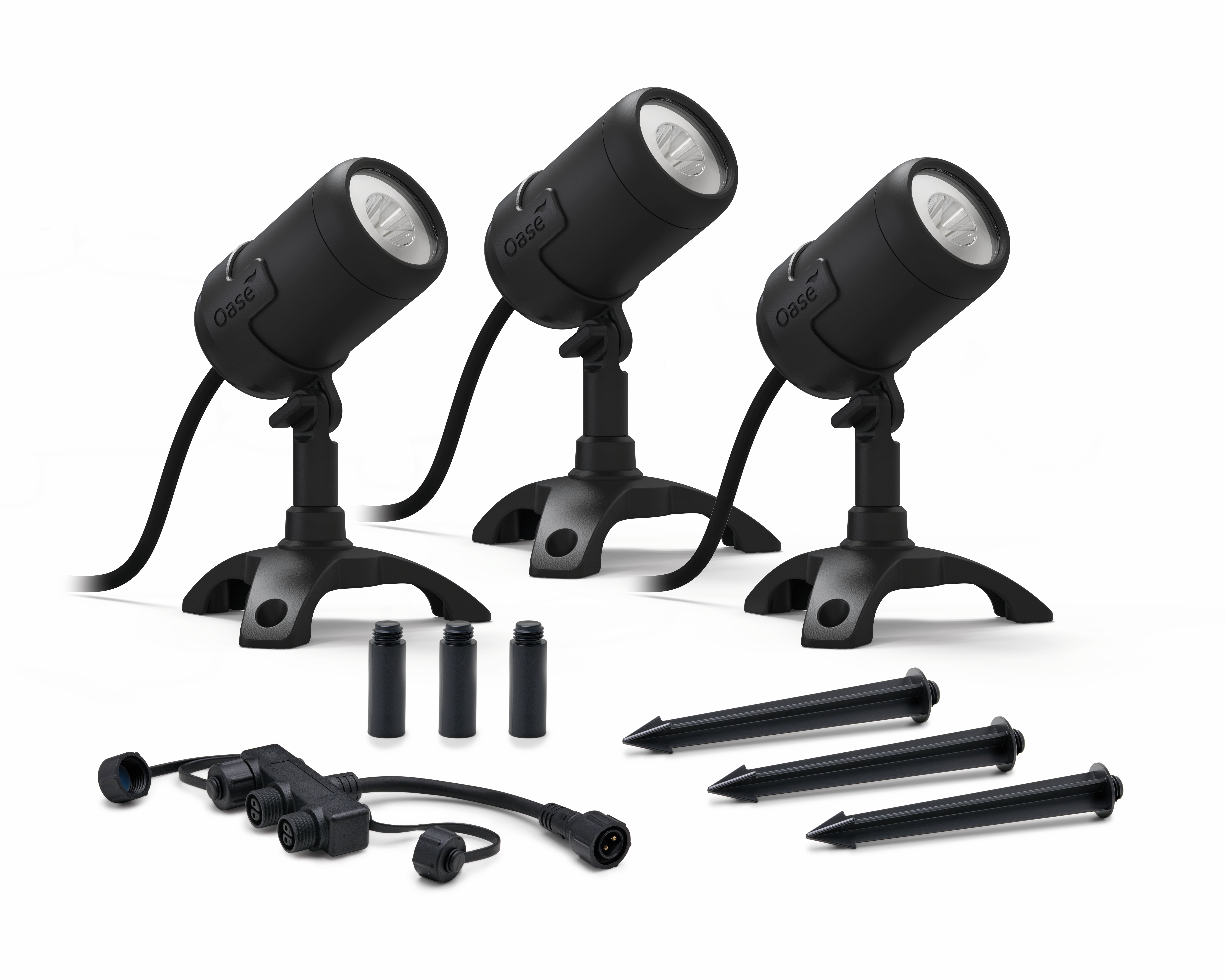 3er Komplett-Set aus IP68 LED-Leuchten weiß 250 lm mit jeweils 3 m Kabel, Dreifach-Verteiler und 36 W Netzteil. Als Teil der LunAqua Connect-Serie jederzeit erweiterbar um smart steuerbaren Controller (per OASE Switch APP) und weitere weiße und RGB Leuchten per Verlängerungskabel und Verteiler.