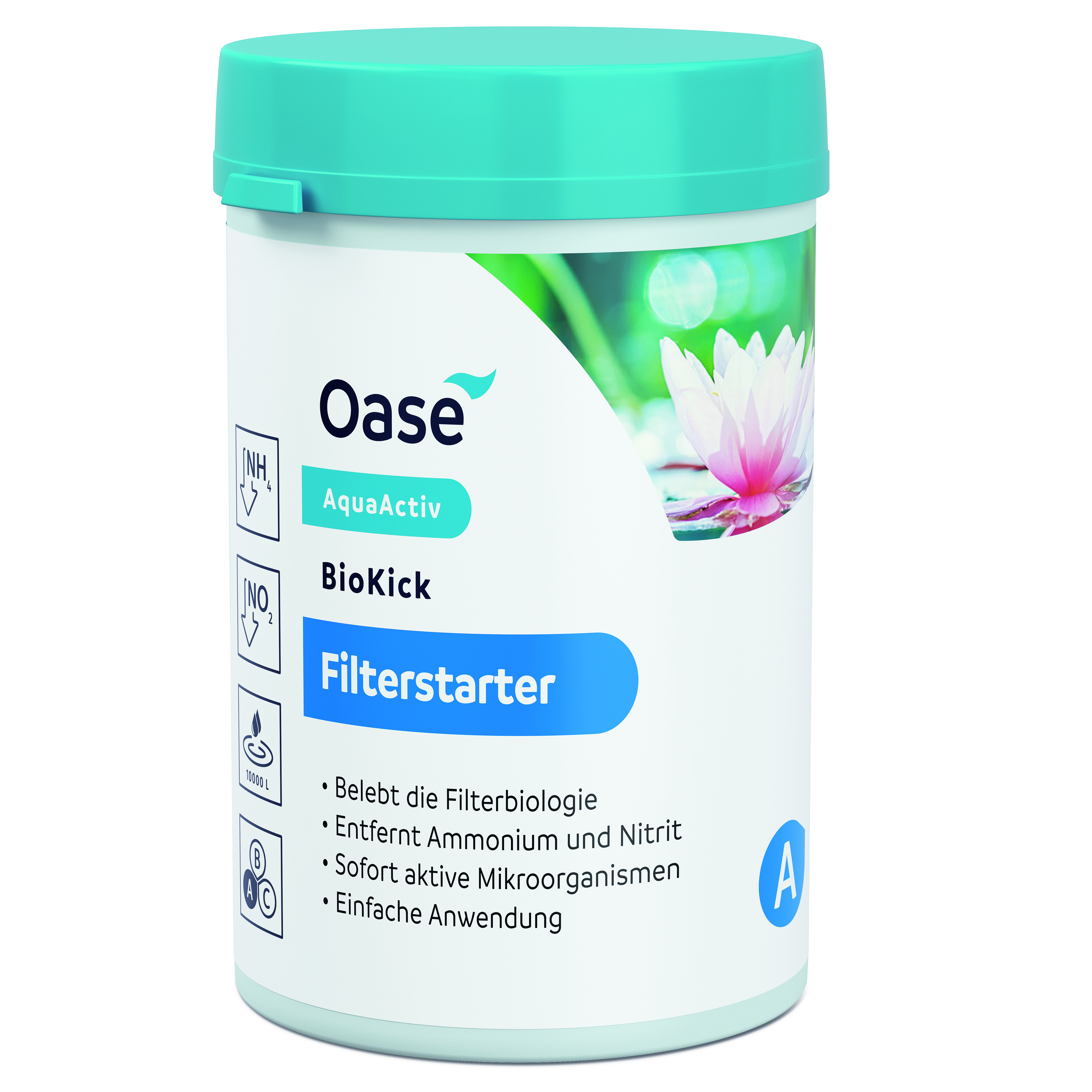 Der Schnellstarter für den Filter: AquaActiv BioKick erweckt die Biologie des Teichfilters bereits nach kurzer Zeit zu vollen 100 %. Die winzigen Bakterien und Mikroorganismen siedeln sich an den Filterschwämmen an und sorgen so dafür, dass der Schmutz aus dem Teich optimal biologisch abgebaut werden kann. Dadurch wird er direkt von Nitrit, Ammonium oder Ammoniak entgiftet und der Filter kann seine volle Wirkung erreichen. BioKick wird ebenfalls bei einem Teilwasserwechsel oder einer Filterreinigung empfohlen.